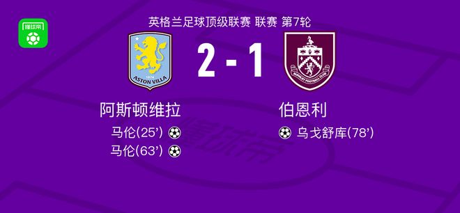 第63分钟,马伦禁区抽射破门梅开二度,维拉2-0伯恩利