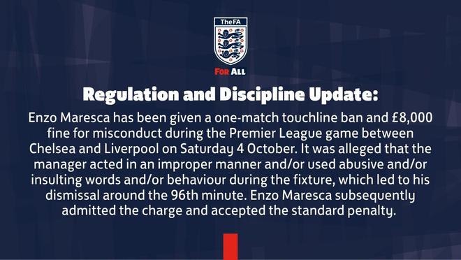 马雷斯卡因为在10月4日切尔西对阵利物浦的比赛中行为不当被禁赛1场并且罚款8000英镑,据称,他在比赛中表现不当,或者使用了侮辱性语言和/或行为,这导致他在第96分钟左右被罚出场。马雷斯卡随后承认了指控,并接受了标准处罚。(公告完)